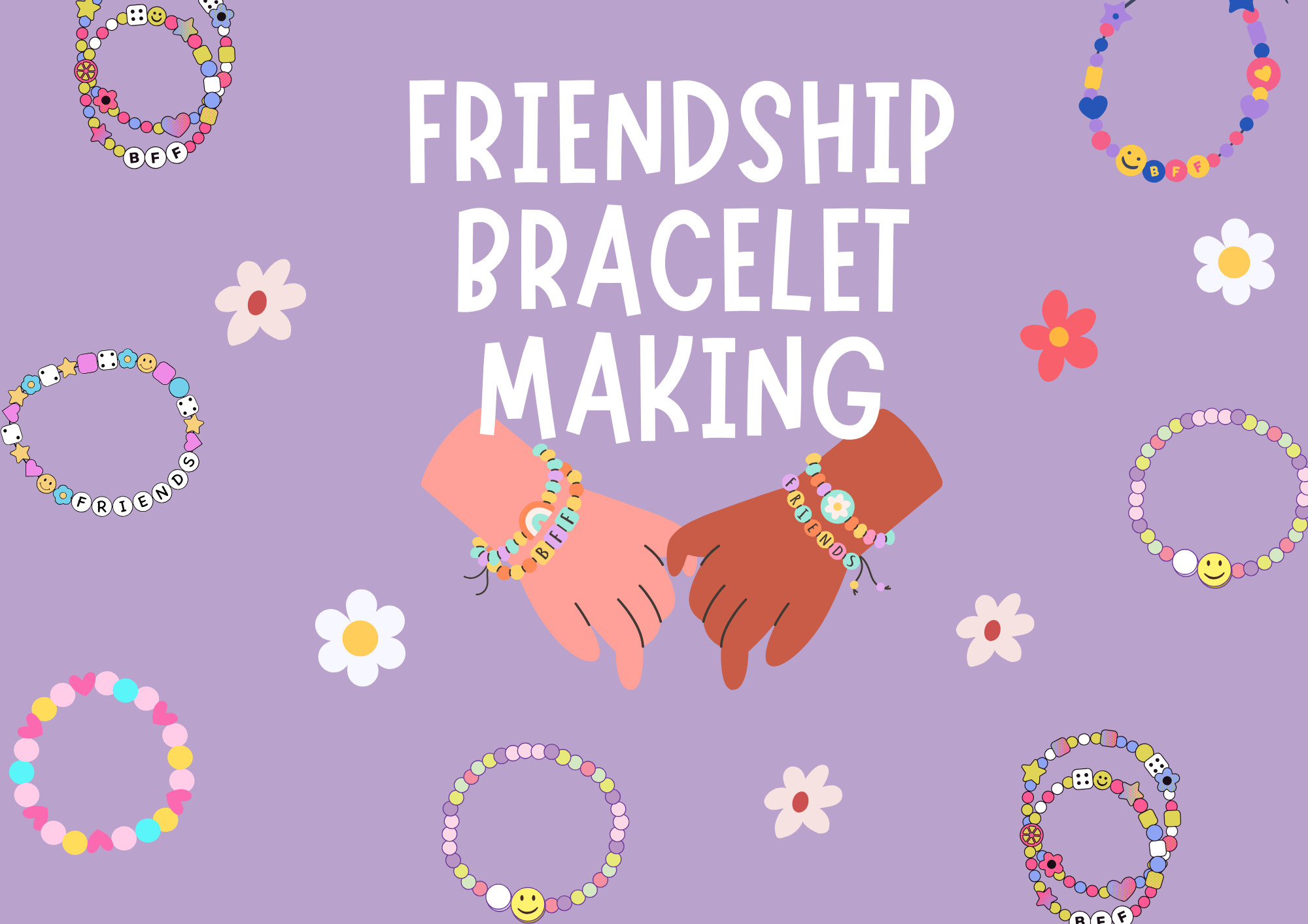 Join us for a fun-filled and creative afternoon of friendship bracelet making! Whether you’re a beginner or a bracelet pro, this event is all about connecting, crafting, and celebrating the bonds we share. Create colorful, unique bracelets for yourself or your besties, and exchange them as a sweet reminder of your special connections. It’s a chance to relax, get creative, and spread the love—one knot at a time! Don’t miss out on this heartwarming event! 🧵✨
