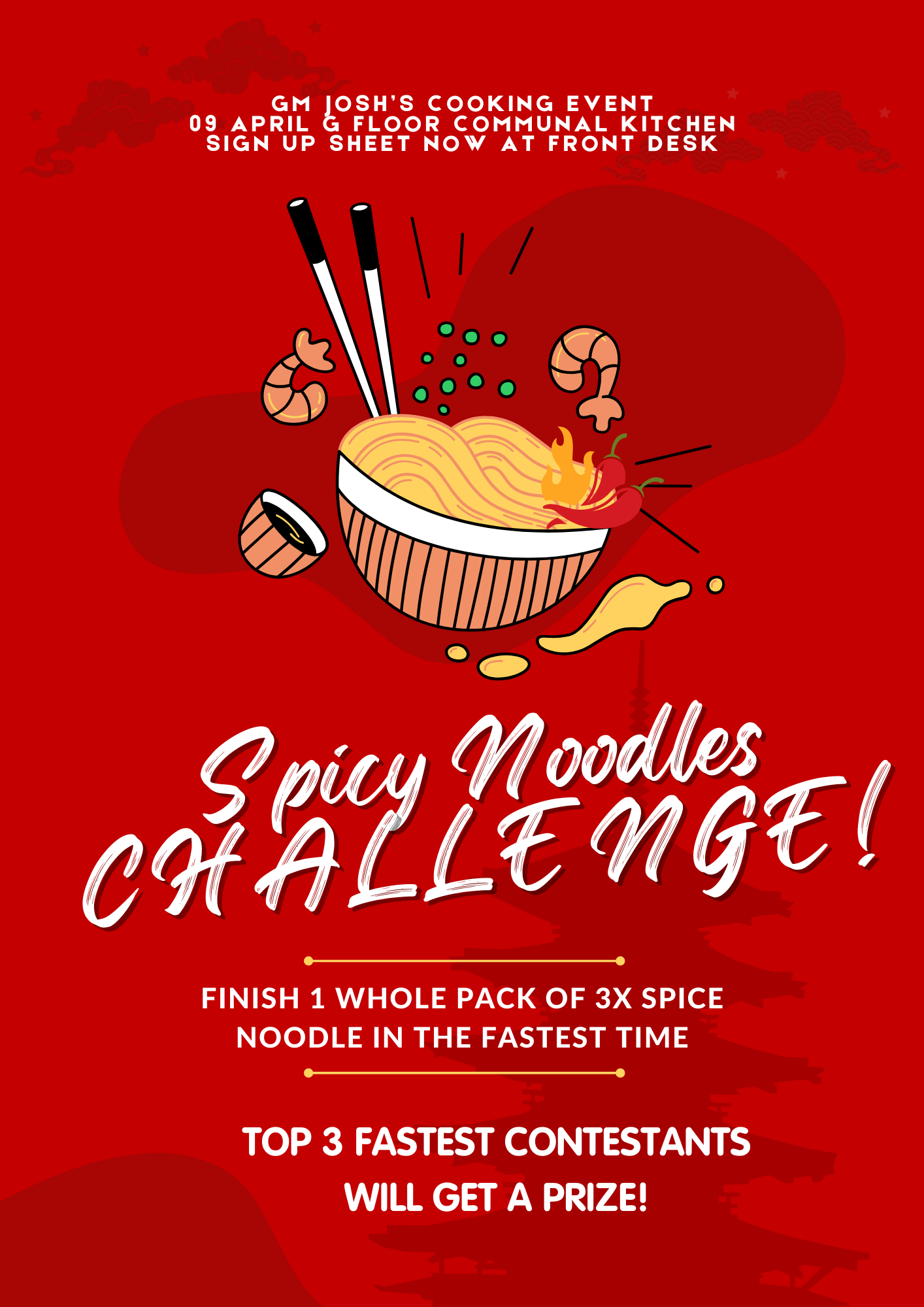 For those who loves spicy food, its your time to shine! For those who don’t, its time for a challenge! Join us to challenge your fellow residents, serving by your chef Joshua. Top 3 participants that finish a full bowl of noodles quickest will win a PRIZE!