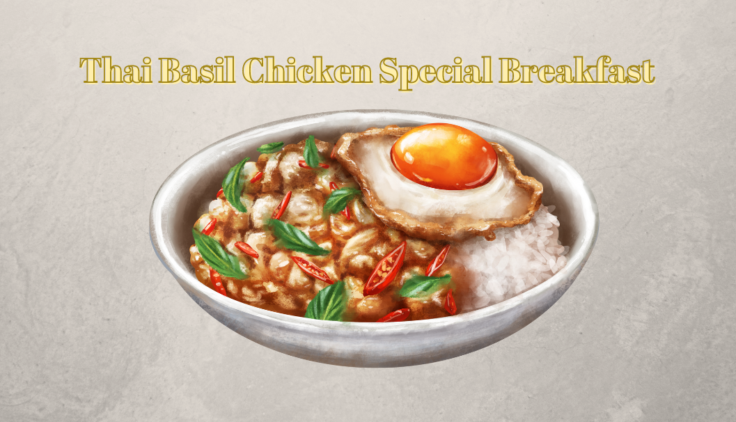 Start your day with a savory bowl of minced chicken with fresh basil, garlic, and chillis with warm jasmine rice. Get a taste of the authentic Thai dish and let the flavors take over you!